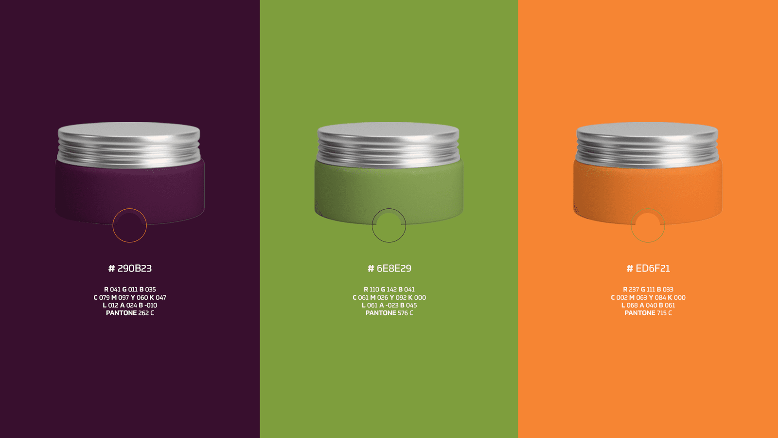 Nature Green (#6E8E29 | Pantone 576 C): The vital accent. Used to break the seriousness of the purple, delivering a message of natural ingredients, freshness, and wellness.